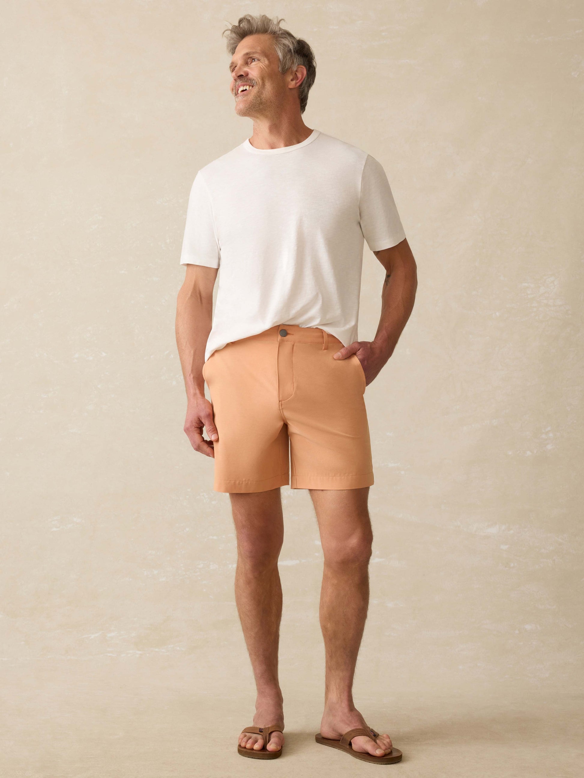 You know them, you love them, our All Day™ Shorts look perfectly tailored with a flat front style and have the water-repellant technical performance of swimwear for increased movement and breathability. Finished with an inner drawstring, mesh-lined pockets, and a zipper fly, these shorts are expertly crafted for all-day functionality (hence its name). Improved from the previous generation to be lighter, quicker-drying, and more comfortable with: Lighter-weight fabric Softer, lighter-weight drawcord with silicone tip instead of metal Lighter-weight zippers (at fly and wearer's right back pocket) Lower profile shank at center front closure Accent fabric at interior waistband