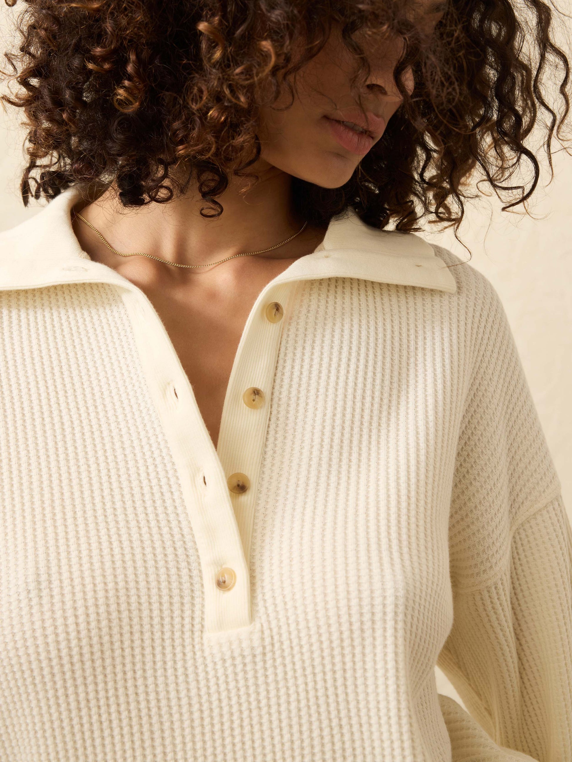 Our waffle-textured henley is made for those in-between days. The soft, textured fabric adds just the right amount of coziness while keeping things airy and comfortable. Designed with a casually laid back silhouette that pairs perfectly with your fave denim.