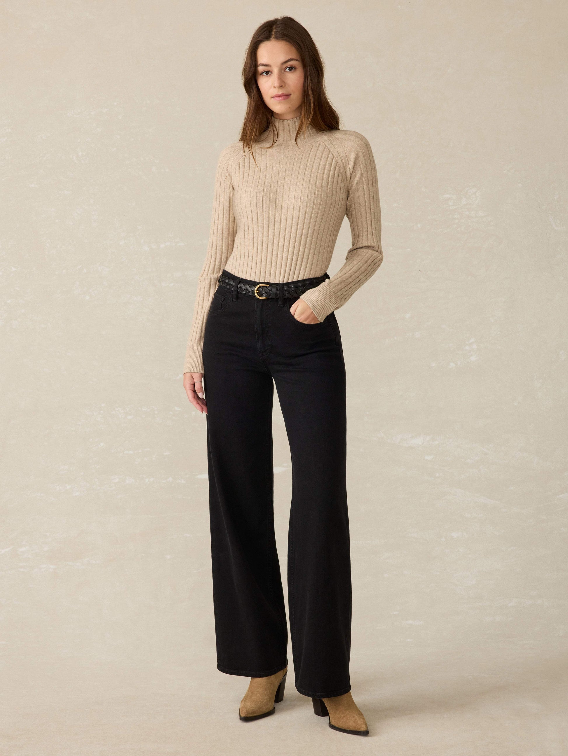 - Detail: Denim 5-pocket highrise wide-leg jean. Super soft, drapey, lightweight stretch denim fabric. Dark black wash.