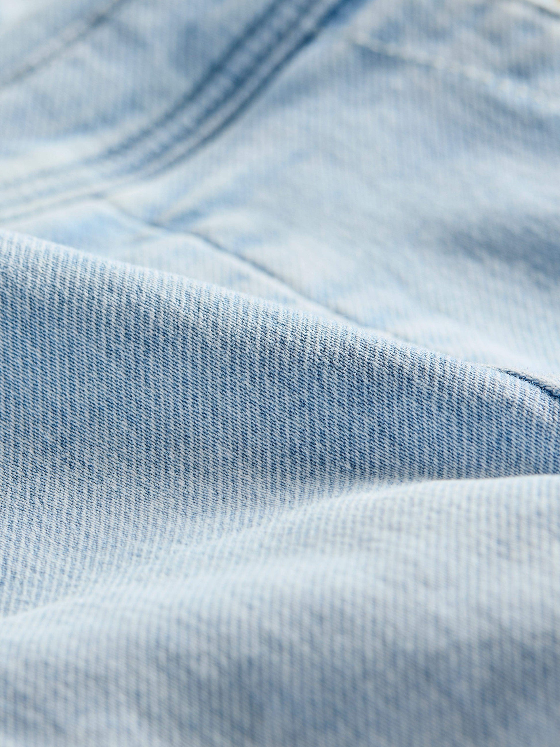 • Detail: Stretch Terry Overall. Button closure at the shoulder strap ends and at the waist seams. Light indigo wash.