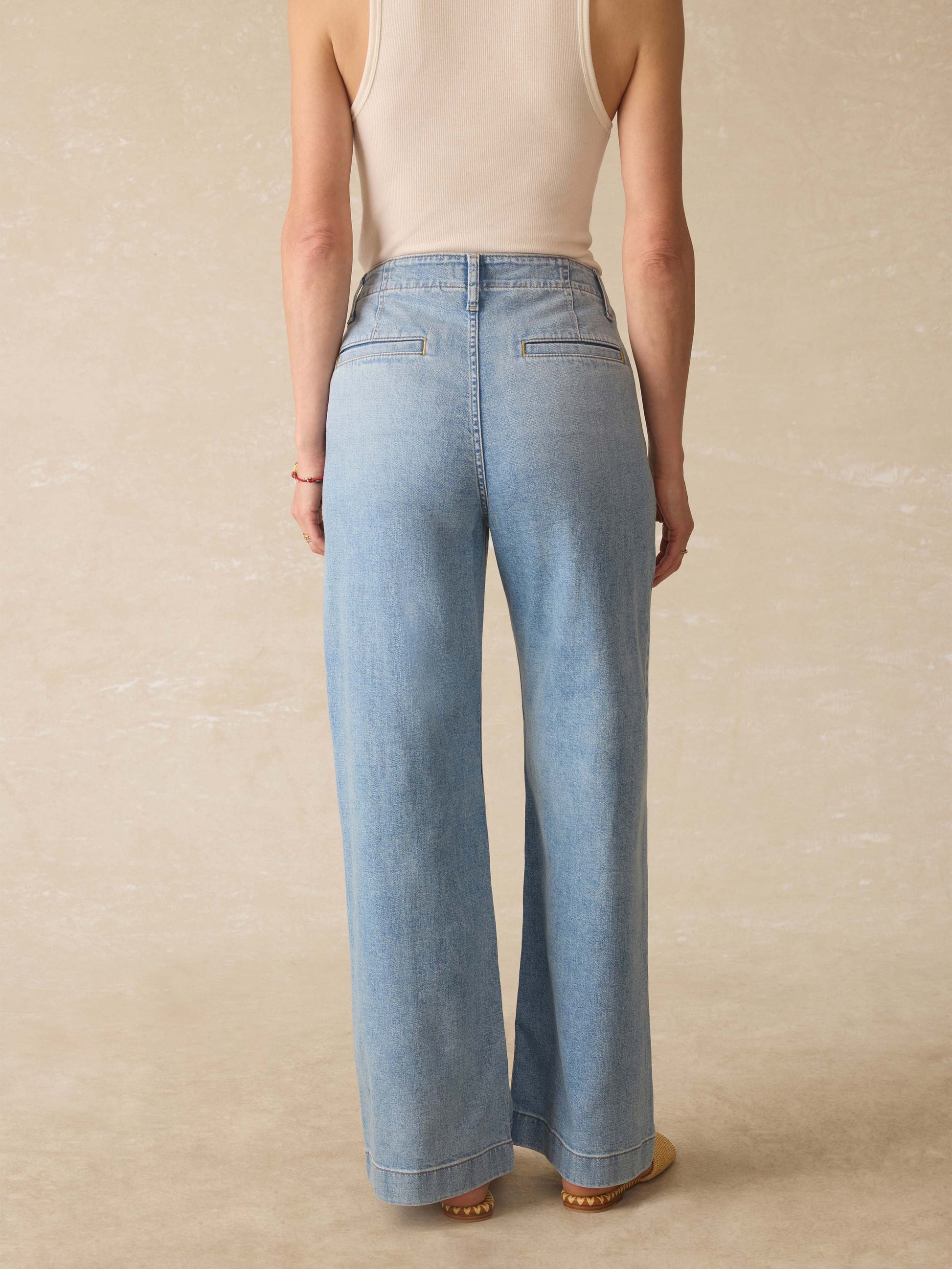 - Detail: Linen denim pant with hollywood waistband. Slant pockets at front with one welt pocket at wearer's front right. Welt pockets at back.