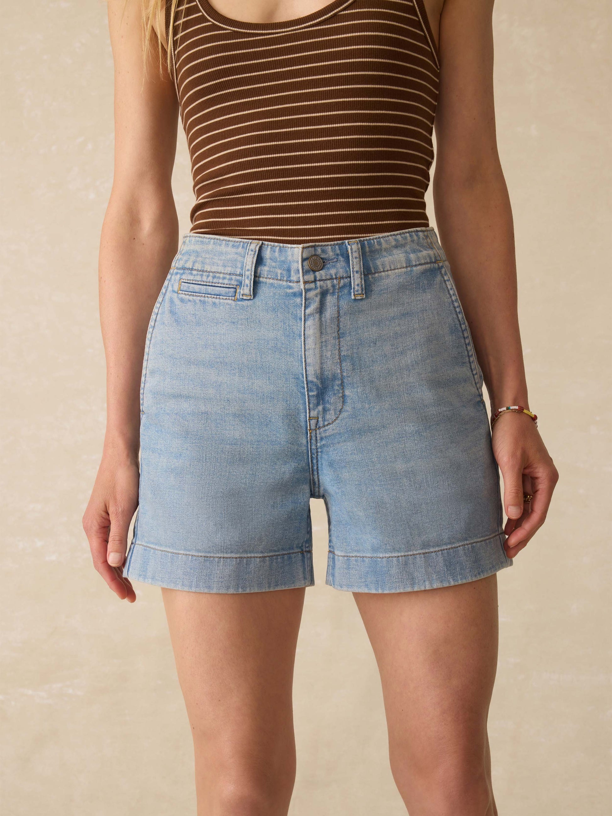 - Detail: Linen denim short with hollywood waistband. Slant pockets at front with one welt pocket at wearer's front right. Welt pockets at back.