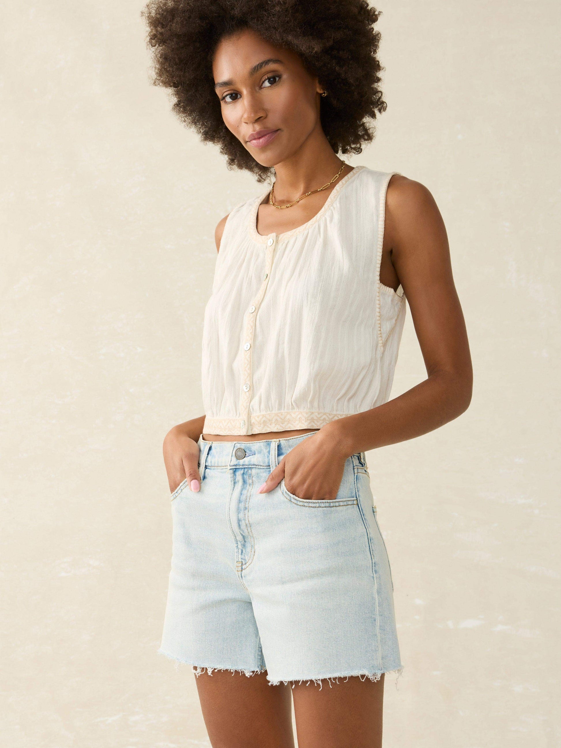 Featuring the worn-in look you love with just the right amount of stretch, our new denim shorts are the only pair you need for summer. With classic 5-pocket styling and a laid back vintage wash with frayed hem, it's our newest essential for sunny days. Our organic cotton denim features an innovative, energy-efficient wash process that utilizes 80% less water than conventional denim wash methods.