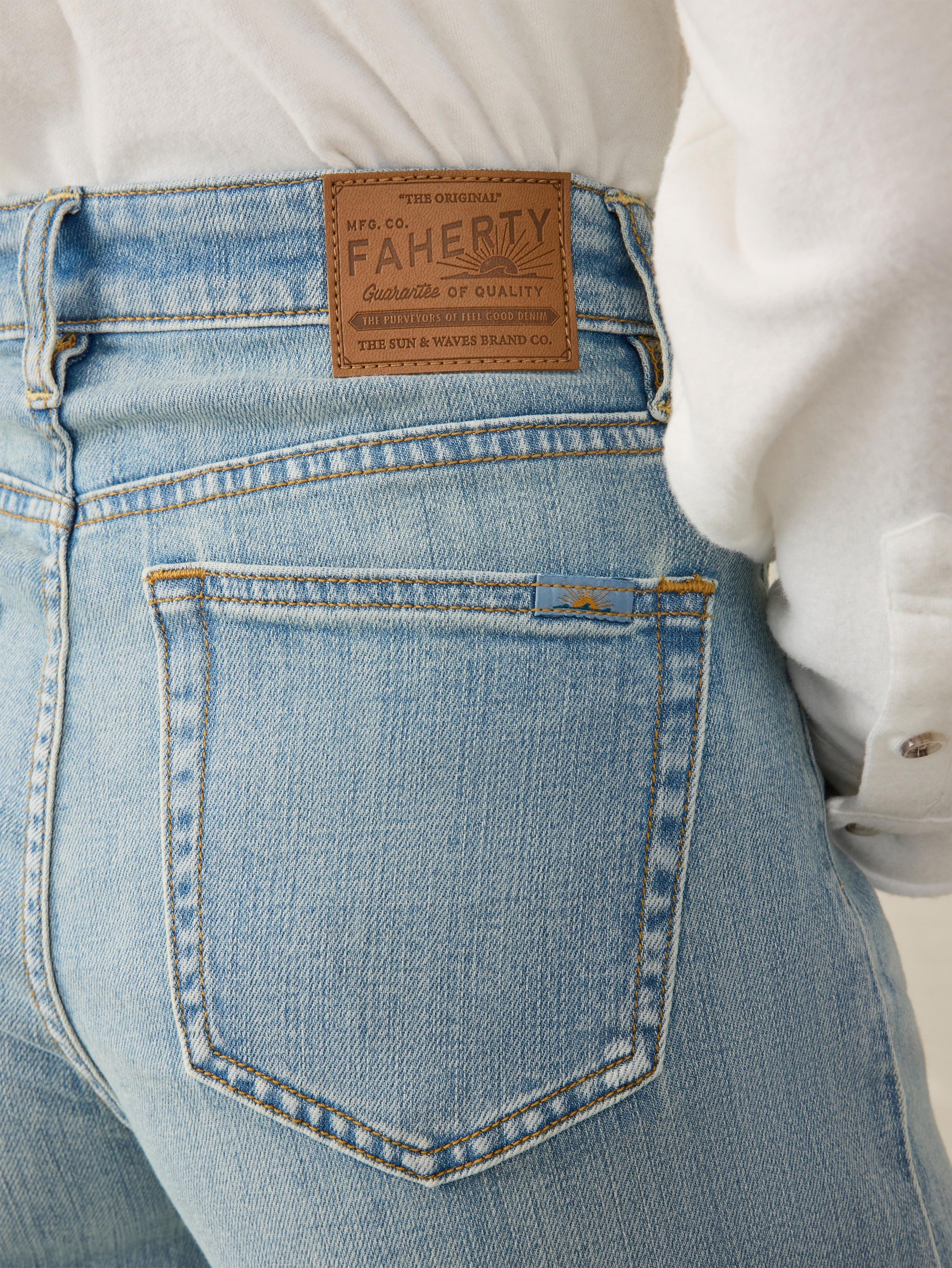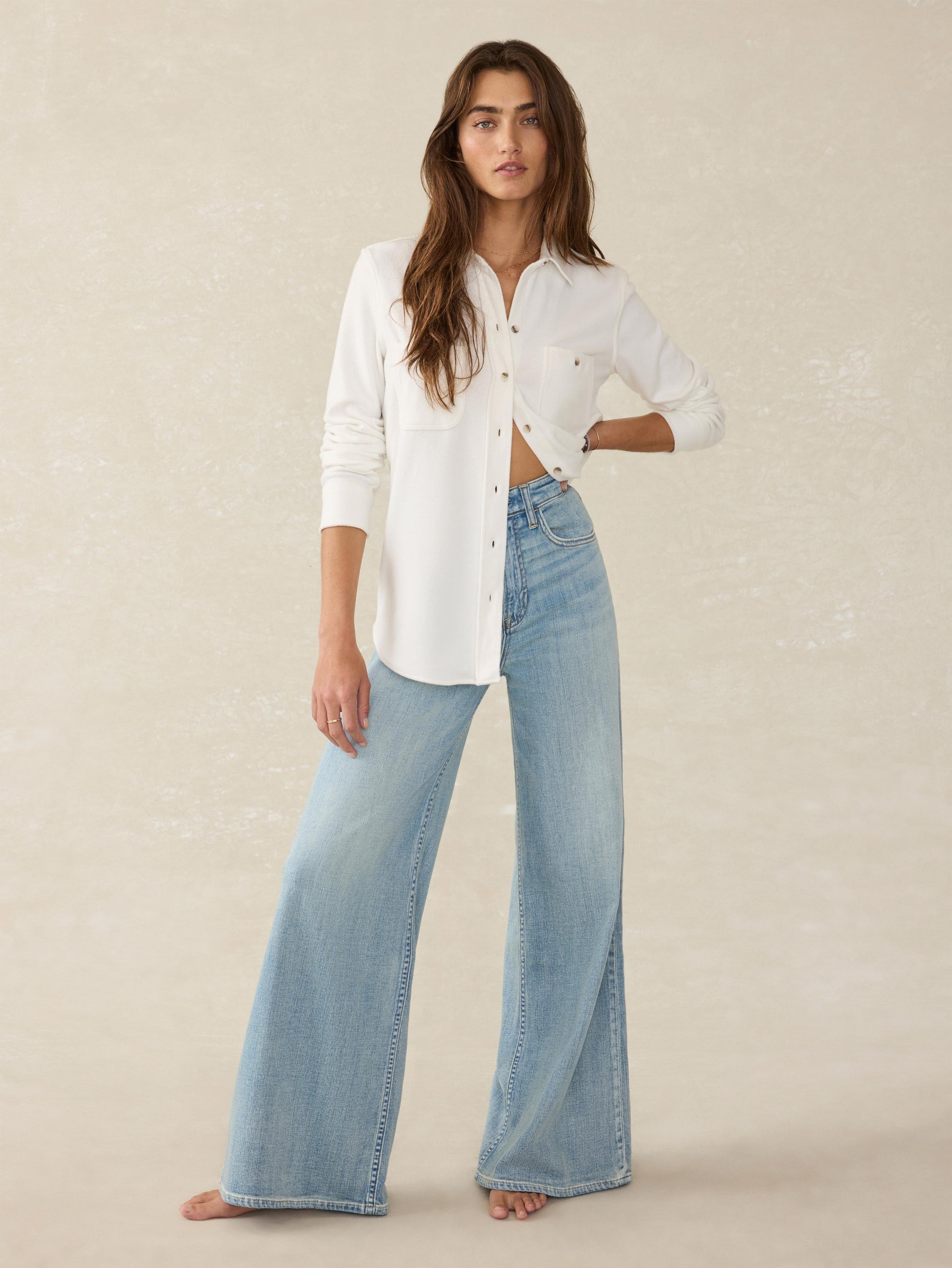 These new feather-light jeans are an ode to the most comfortable, broken-in denim you've ever had. Think super soft, stretchy, and breezy with a laidback drape that moves with you. Constructed with a high waist and wide leg, its easygoing essence was made for beachside strolls and weekend getaways in mind.
