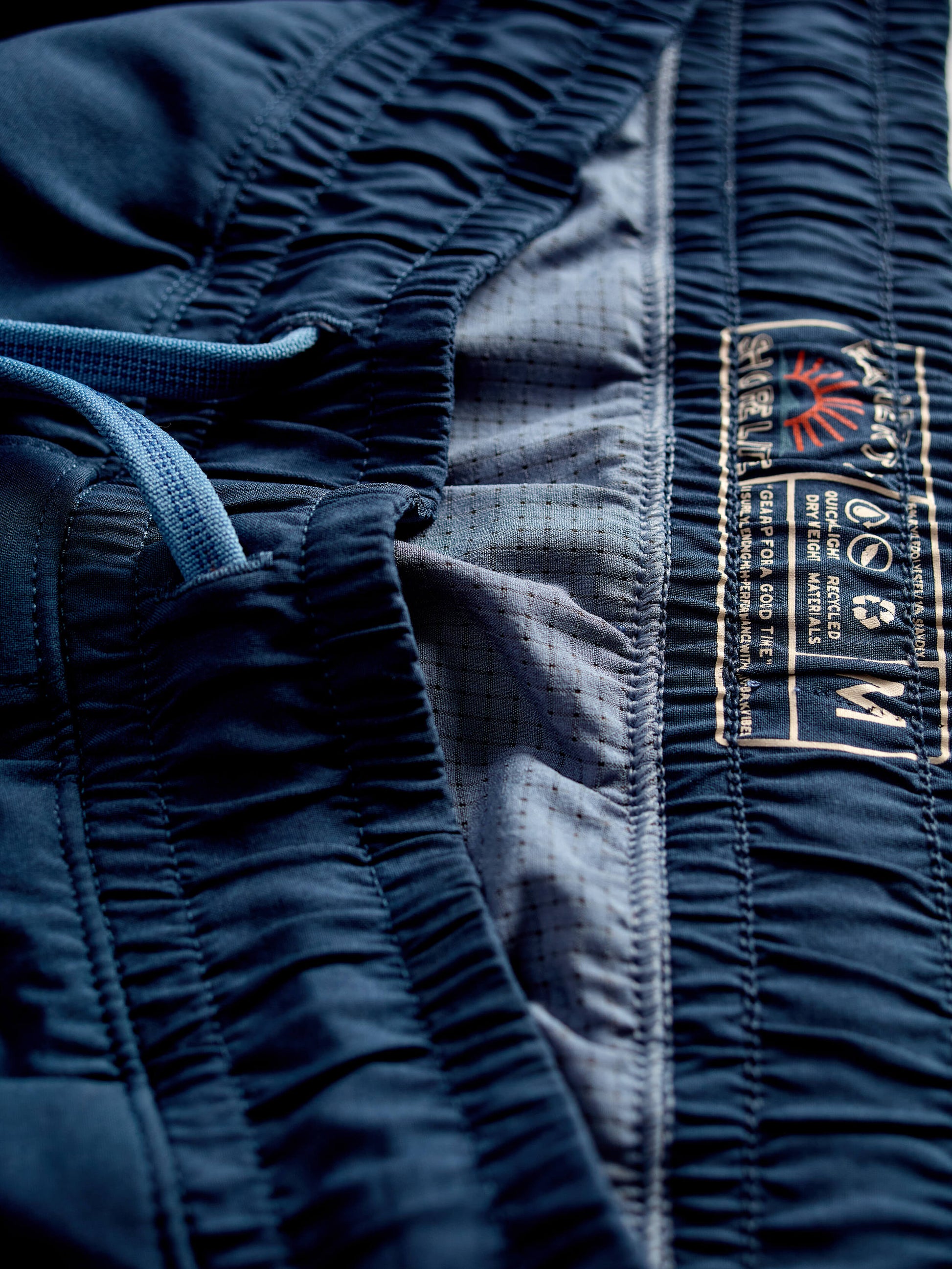 - Detail: Elasticated waistband. Lightweight drawcord with rubberized tips. Front slash pockets with hidden zipper at wearer's left front side seam. Welt pocket at wearer's right backside with hidden zip closure. Media pocket on wearer's left side of compression liner. Gusset at crotch for improved comfort and mobility. Side seam vents. Woven Sun & Waves label at wearer's left hem.