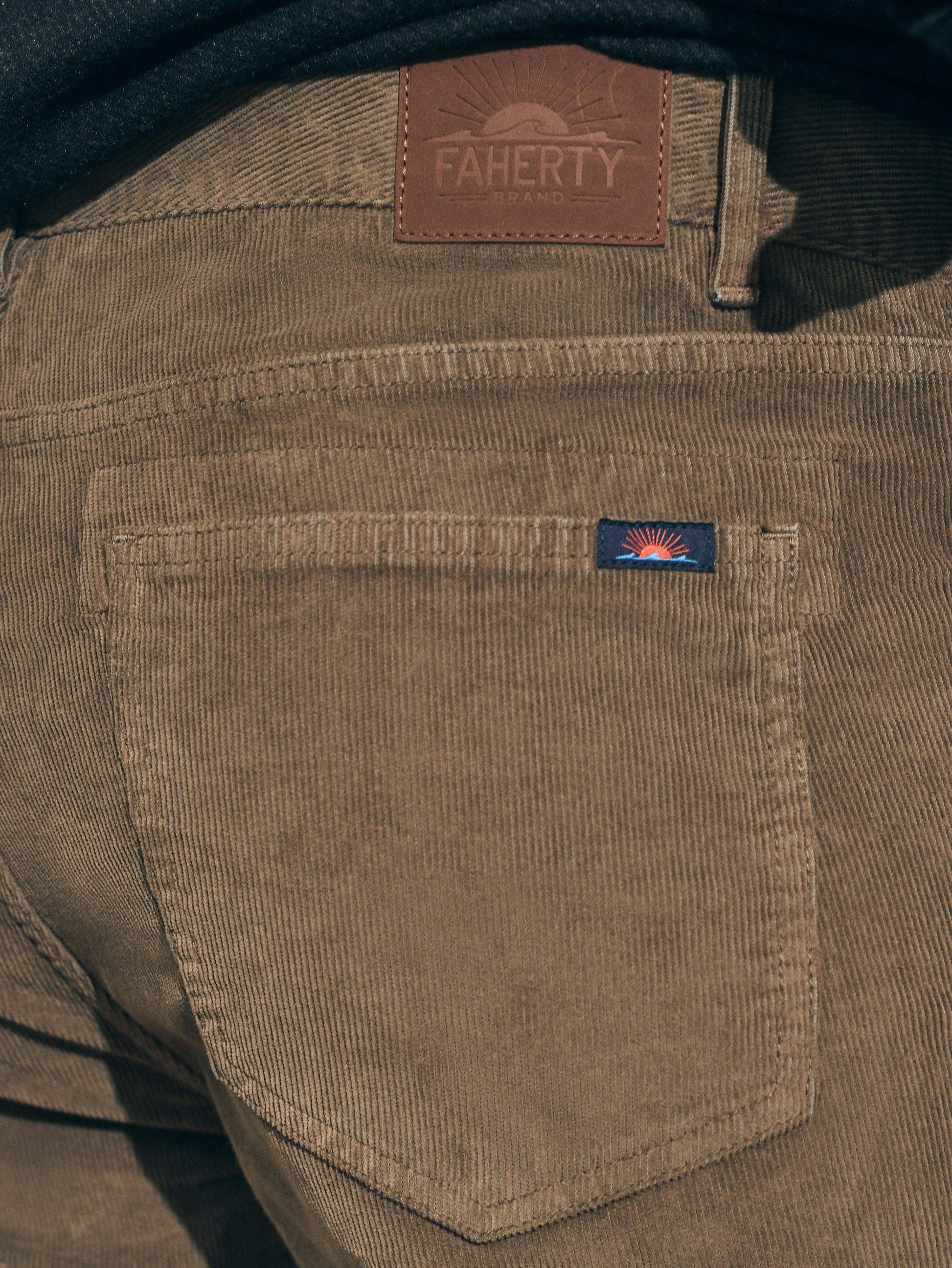 - Detail: Belt loops. Classic 5-pocket styling. Metal Rivets for pocket reinforcements. Metal fly zipper. Faherty logo back patch at wearer's right.