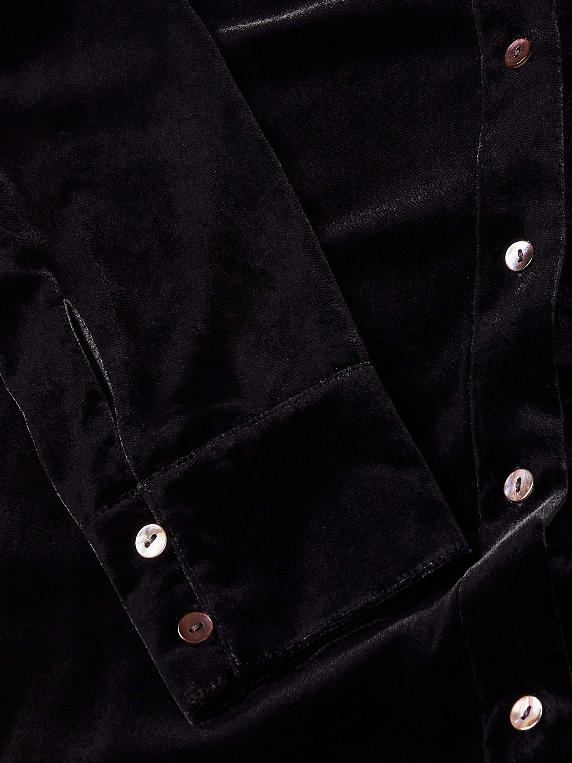 - Detail: Stretch silk velvet with shell buttons and shirring detailing.