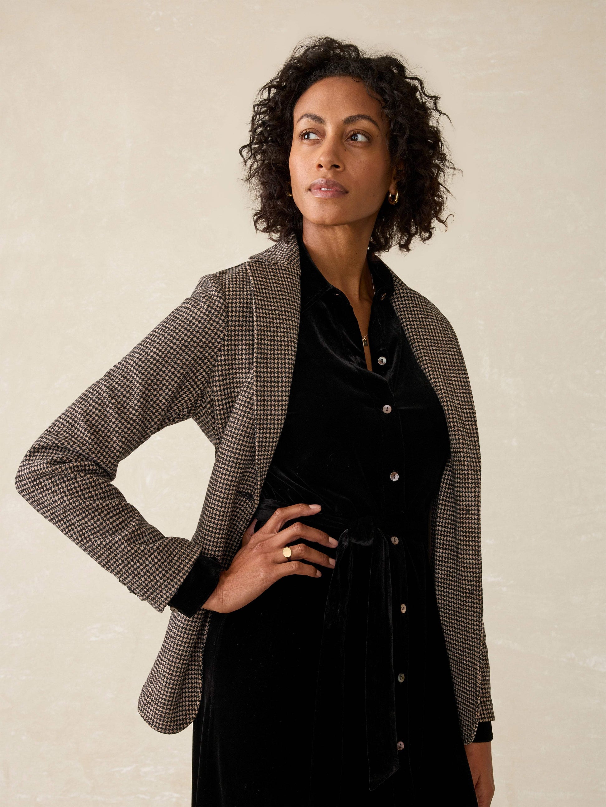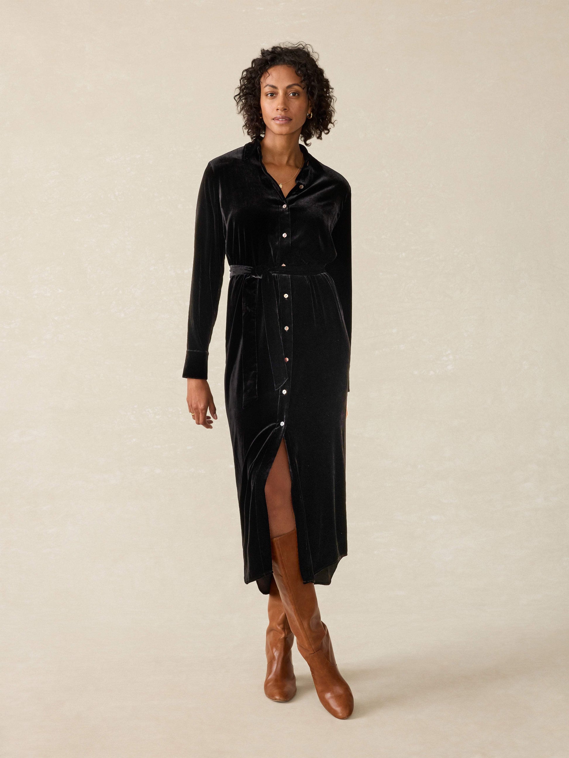 Our silk-kissed fabric adds extra luxury and subtle shimmer to this elegant but no-fuss velvet dress tied with a simple sash. An opened, gathered neckline gives it a lovely drape while gently gathered sleeves complete the charming look.
