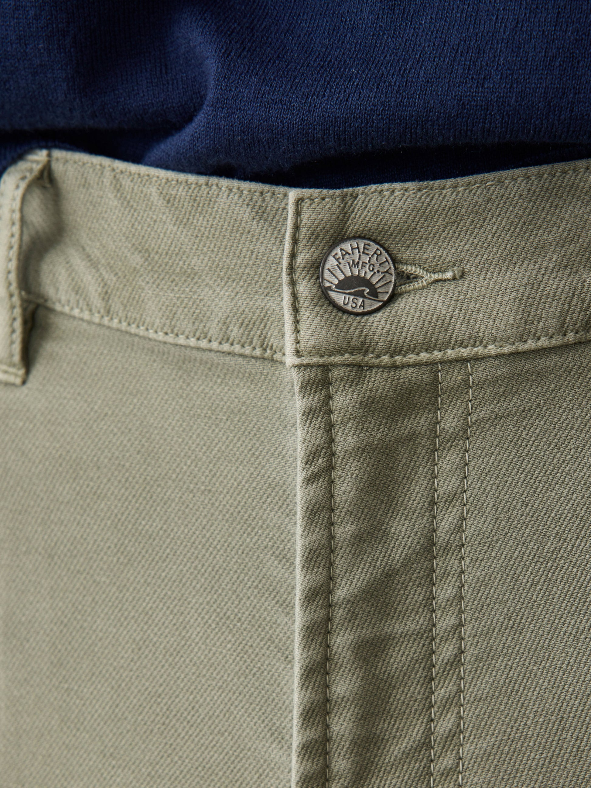 • Detail: Classic 5-pocket Pant. Metal shank and fly zipper opening. Faherty logo back patch at wearer's right.