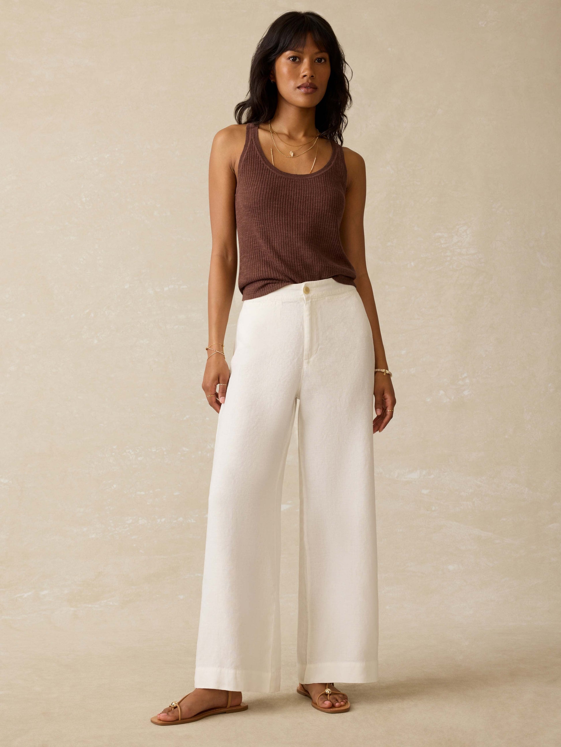 - Detail: Wide leg linen pants with button closure, elastic at back waistband. On-seam front pockets.