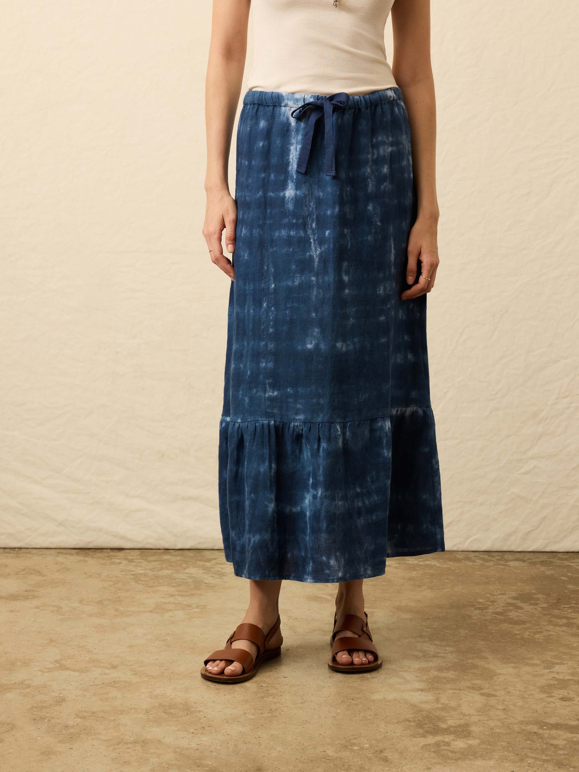 Light as air with just the right amount of drama, this linen skirt brings a breezy silhouette to the season’s moody palette. The elastic waistband keeps it easy and comfortable, while the softly tiered shape adds graceful movement with every step. Washed in an earthy tie-dye print, it pairs effortlessly with a simple tank and sandals now—and layers just as beautifully with a chunky knit and boots come fall.