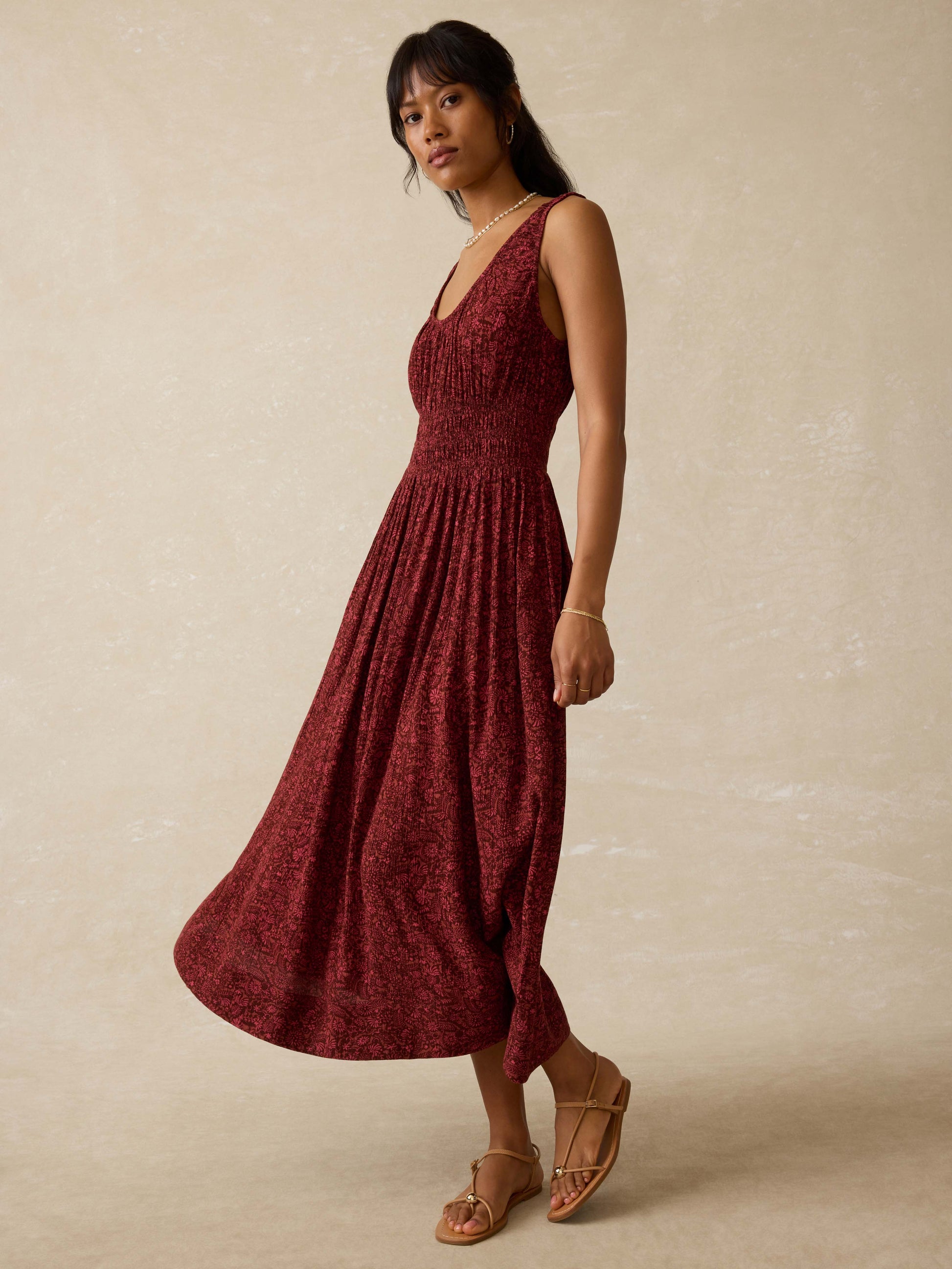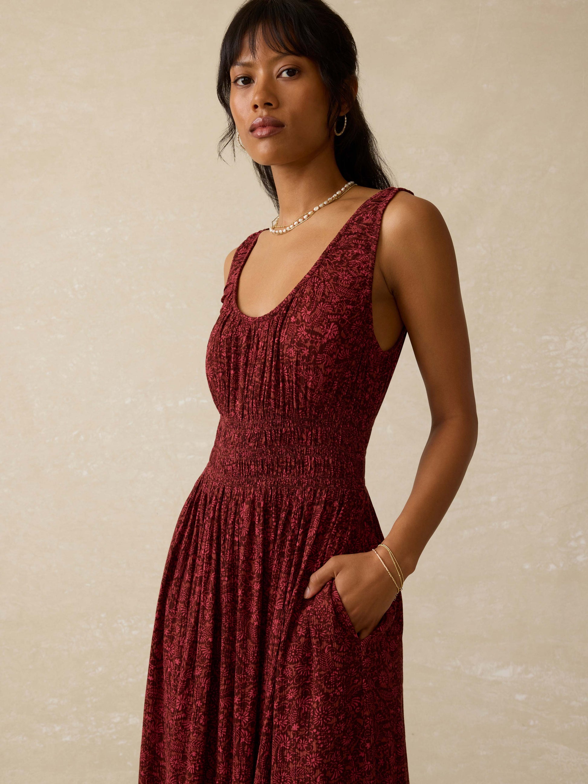 This flowy maxi dress features graceful sleeveless styling and delicate shirring at the waistline for a flattering fit that moves with you. The beautifully saturated and vintage-inspired floral print adds a touch of sophistication, making it perfect for everything from garden parties to dinner alfresco.