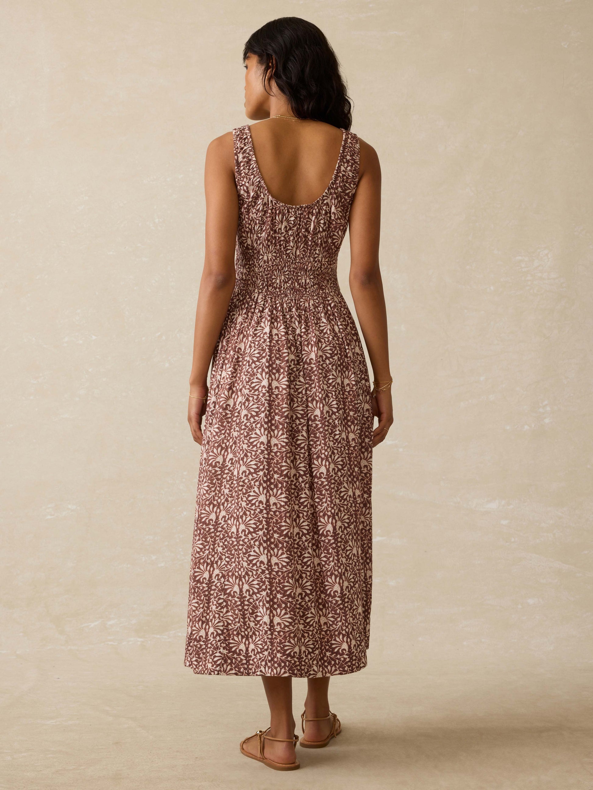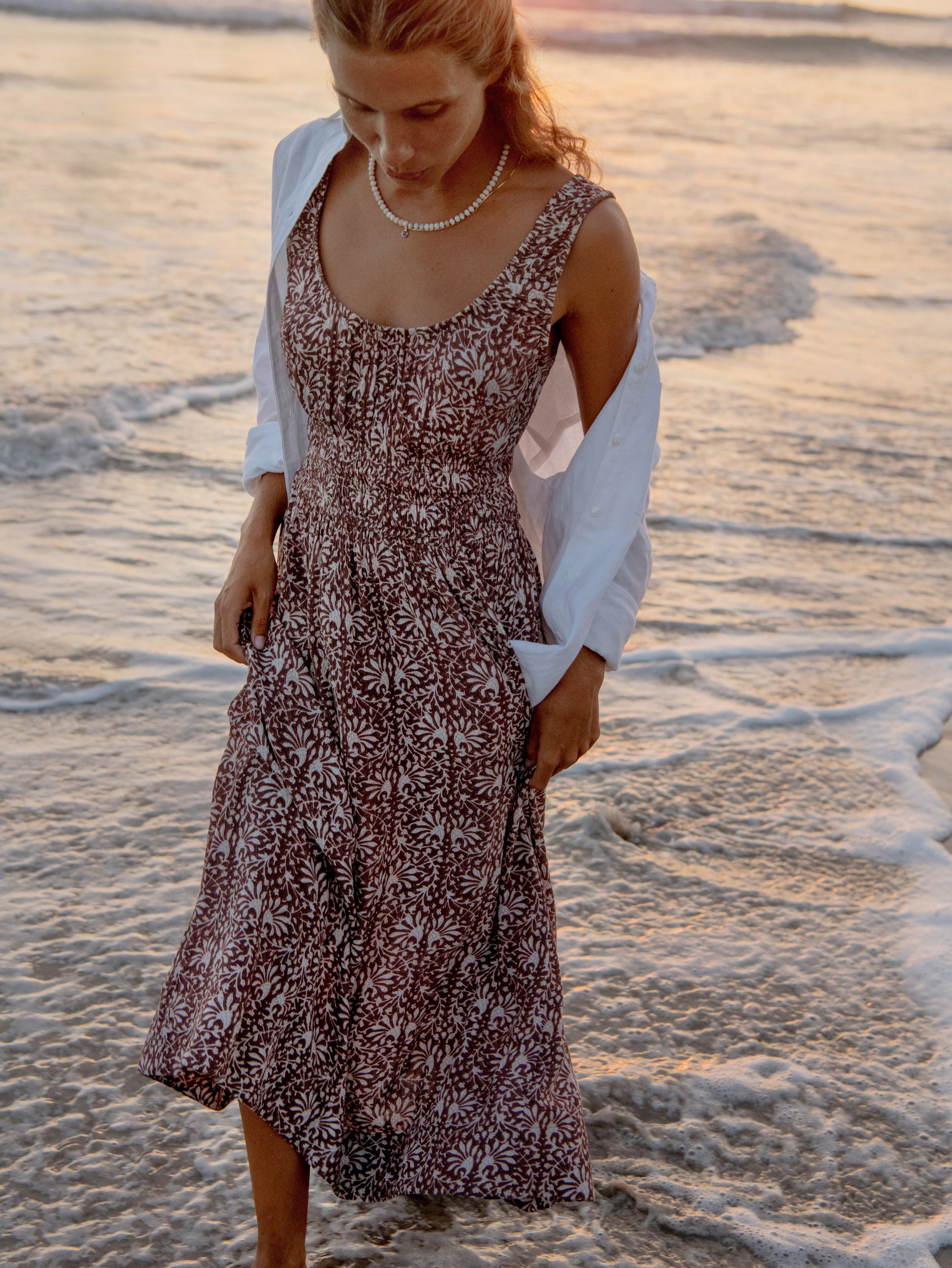 This flowy maxi dress features graceful sleeveless styling and delicate shirring at the waistline for a flattering fit that moves with you. The beautifully saturated and vintage-inspired floral print adds a touch of sophistication, making it perfect for everything from garden parties to dinner alfresco.