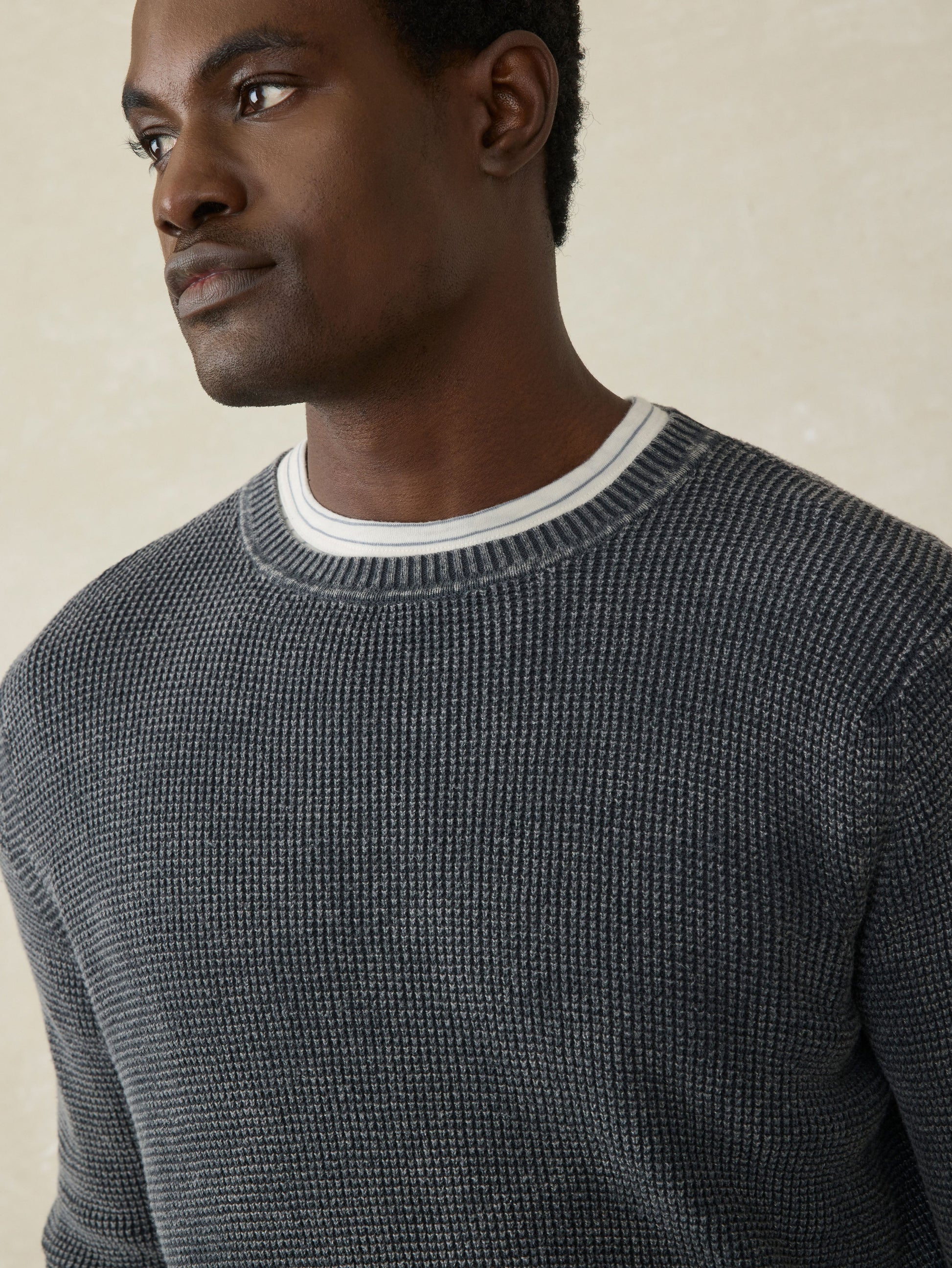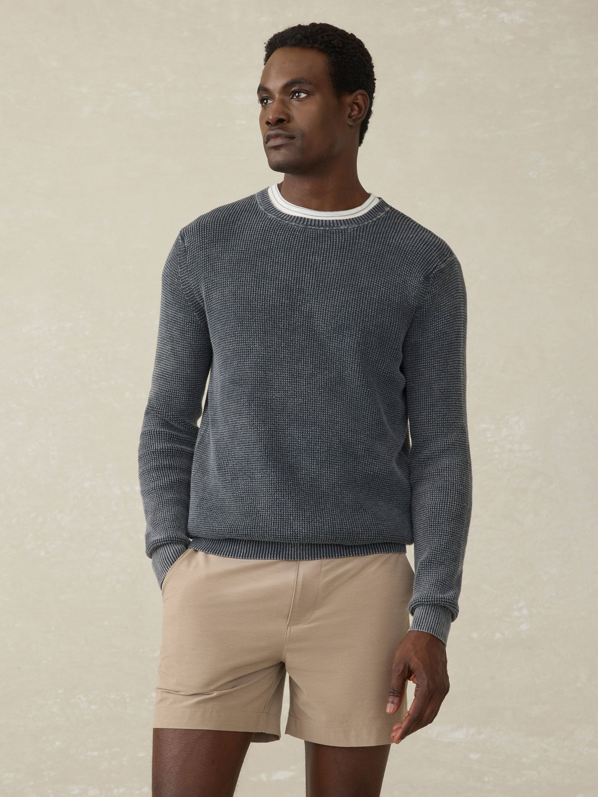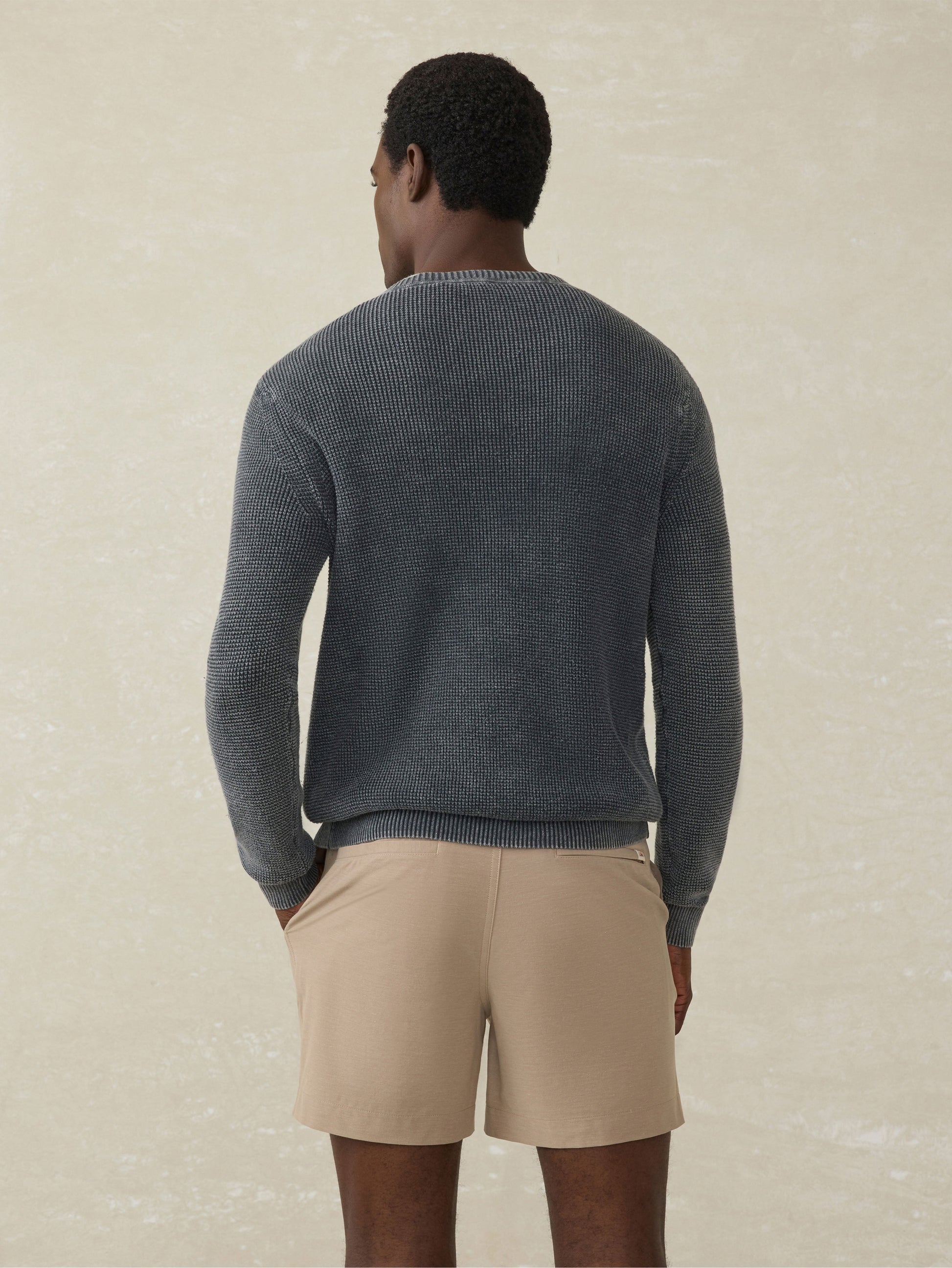 Designed as an easy to wear, transitional sweater., this will be your go-to year-round crew. Our cotton yarn is super soft but not overly warm and knit in an airy, waffle stitch giving the sweater dimension and texture. It's then garment-dyed and washed for a lived in, vintage look and feel that's casually cool for any occasion.