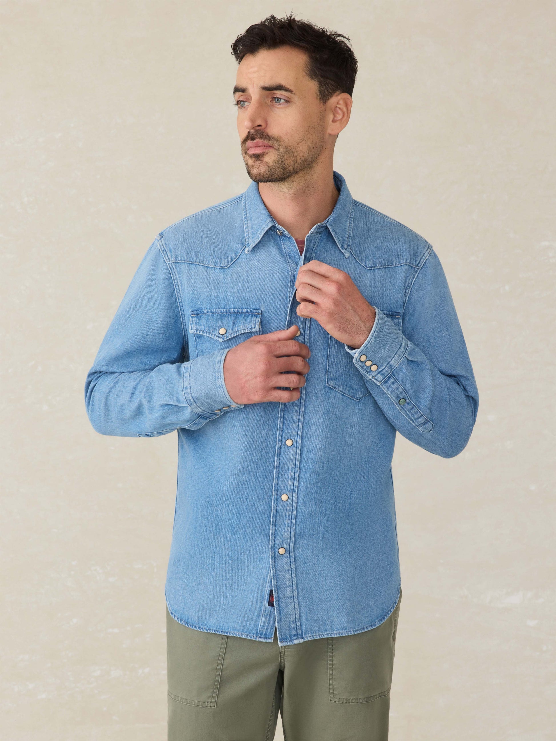 - Detail: Classic western shirt silhouette with a traditional western shirt pointed collar, V-shaped yoke on the front and back, snap button closures, two chest pockets with flaps, and curved shirt tail hem. Faux cream stone snaps at the CF plackets and cuffs, except for the accent faux turquoise snaps at the sleeve plackets. Fabric is light weight denim that’s loosely woven with irregular slub yarns, giving you the light, airy soft hand feel. faded light indigo wash.